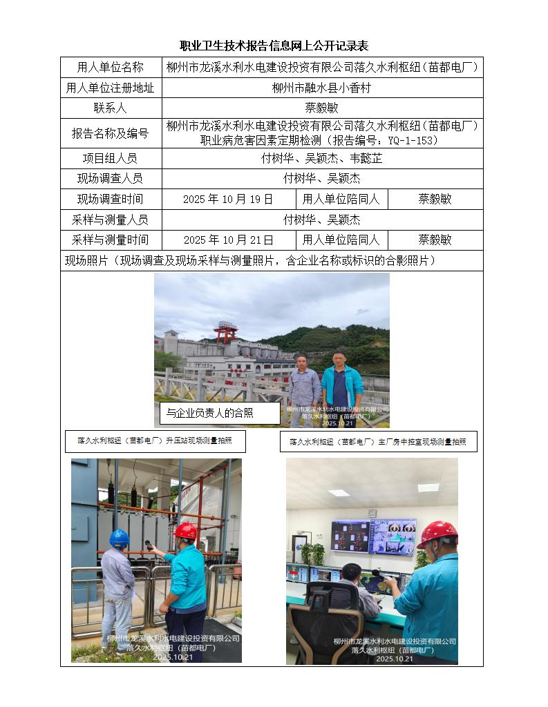 柳州市龍溪水利水電建設(shè)投資有限公司落久水利樞紐(苗都電廠) 職業(yè)病危害因素定期檢測(報(bào)告編號:YQ-1-153)
