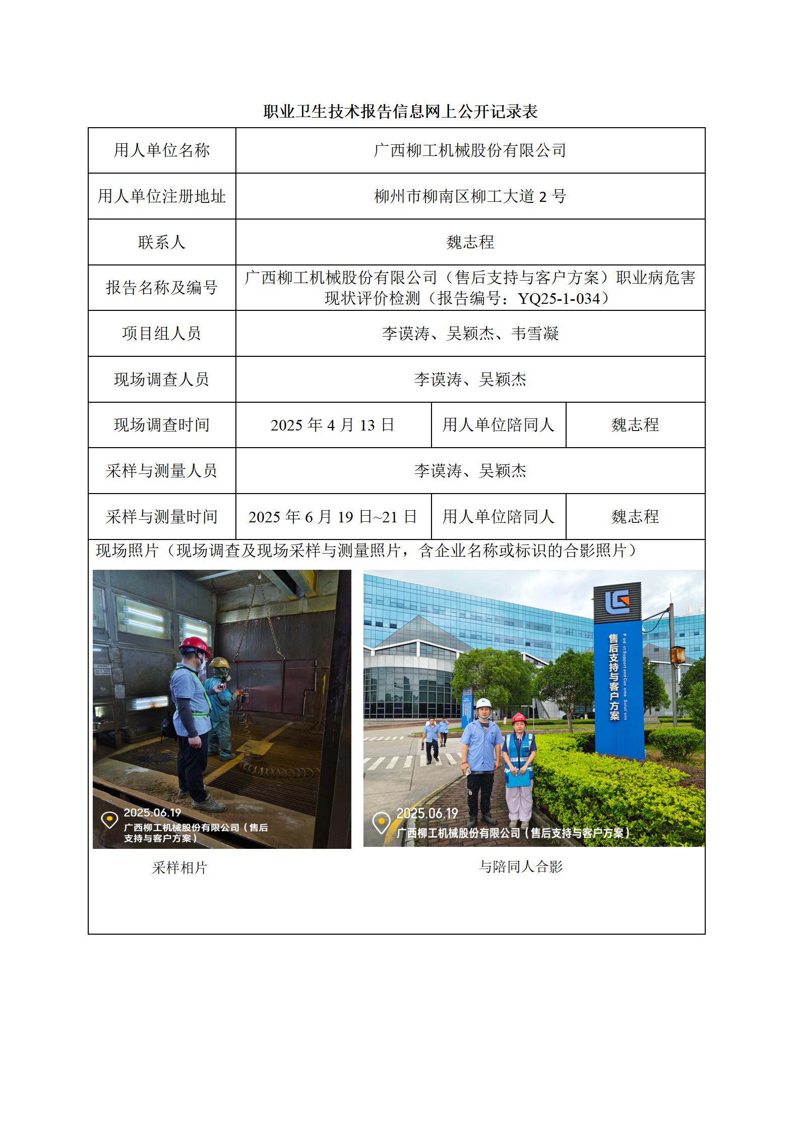 廣西柳工機械股份有限公司(售后支持與客戶方案)職業(yè)衛(wèi)生技術(shù)報告信息網(wǎng)上公開記錄表