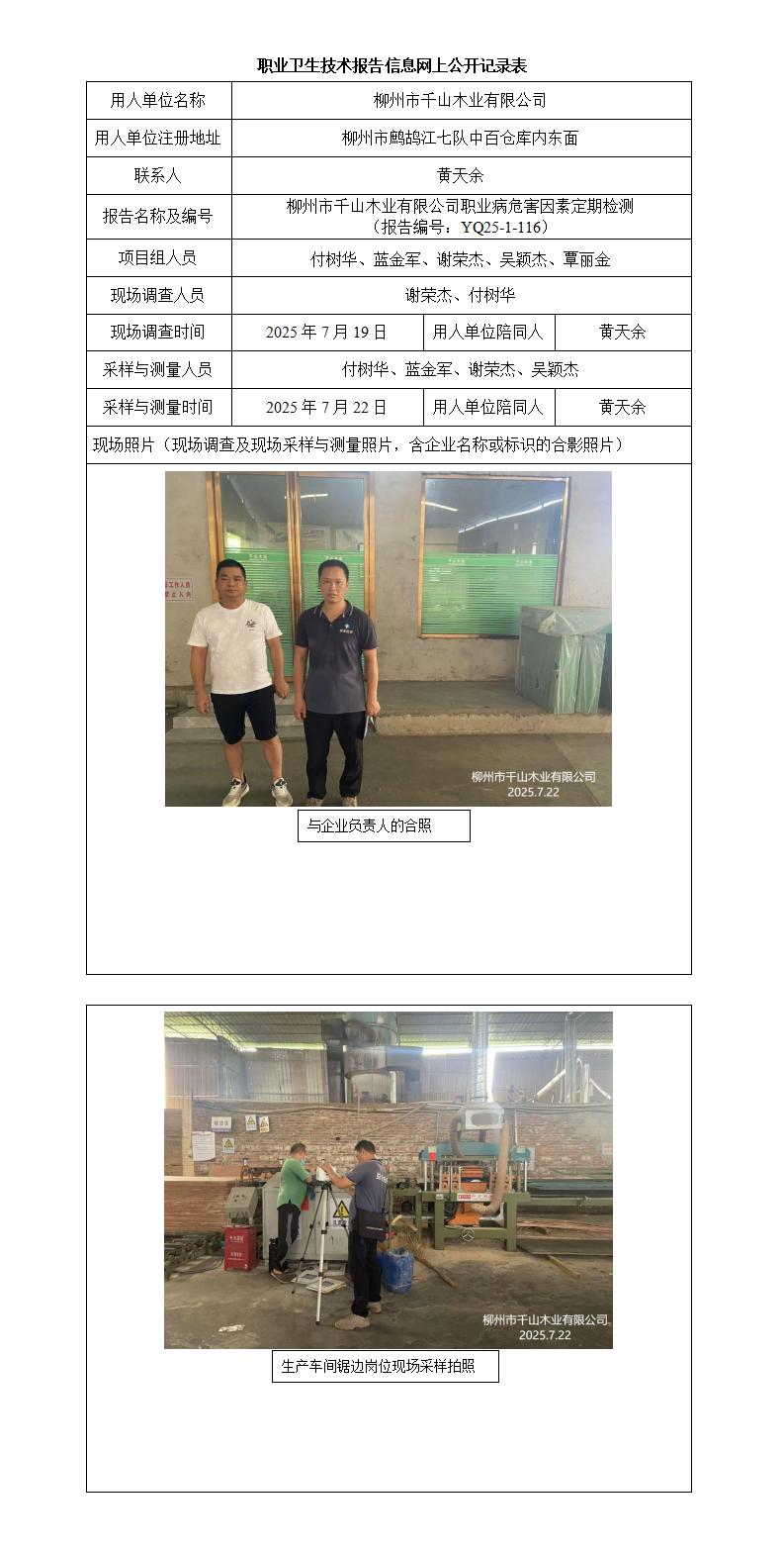 柳州市千山木業(yè)有限公司職業(yè)病危害因素定期檢測(cè)